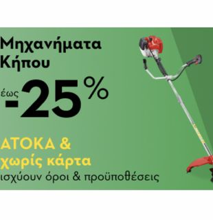 Εξοπλίστε τον κήπο σας με πρακτικά μηχανήματα κήπου από την Praktiker και επωφεληθείτε από εκπτώσεις έως -25%. Η προσφορά ισχύει με άτοκες δόσεις και χωρίς χρήση κάρτας, με δυνατότητα επιλογής μέσα από μια μεγάλη γκάμα εργαλείων για κάθε ανάγκη στον κήπο. Ισχύουν όροι και προϋποθέσεις.