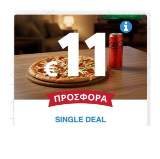 Απόλαυσε μια λαχταριστή πίτσα μαζί με αναψυκτικό σε προνομιακή τιμή μόνο 11€. Ιδανική επιλογή για γρήγορο και οικονομικό γεύμα στο σπίτι, είτε για solo απόλαυση είτε για χαλαρή βραδιά. Μια απλή, ξεκάθαρη προσφορά που αξίζει.
